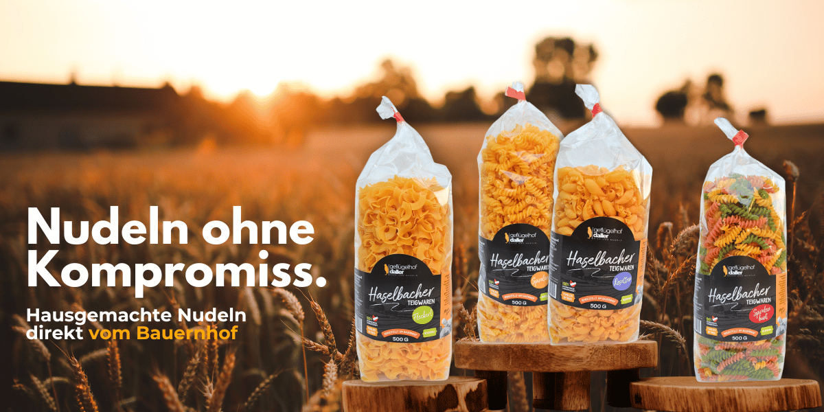 Unser Bauernhof ist seit Jahren ein Familienbetrieb. Ich hatte die Ehre den Betrieb 2023 von meinen Eltern zu übernehmen. Wir vermarkten seit 1992 Eier von unseren Legehennen und seit 1997 gibt es auch unsere Nudeln.